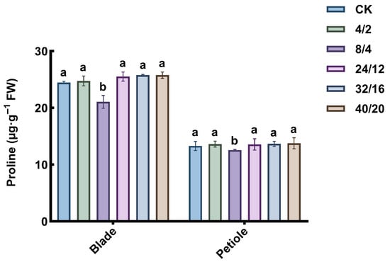 Effects of different light–dark cycles on proline content in celery. Distinct letters placed above the bars denote statistically significant differences (p < 0.05) as assessed by one-way ANOVA followed by Duncan’s multiple range test.