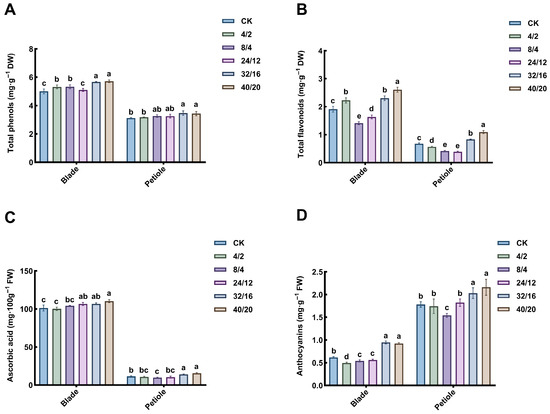 Effects of different light–dark cycles on antioxidant substances in celery. (A) Total phenols, (B) Total flavonoids, (C) Ascorbic acid, (D) Anthocyanins. Distinct letters placed above the bars denote statistically significant differences (p < 0.05) as assessed by one-way ANOVA followed by Duncan’s multiple range test.