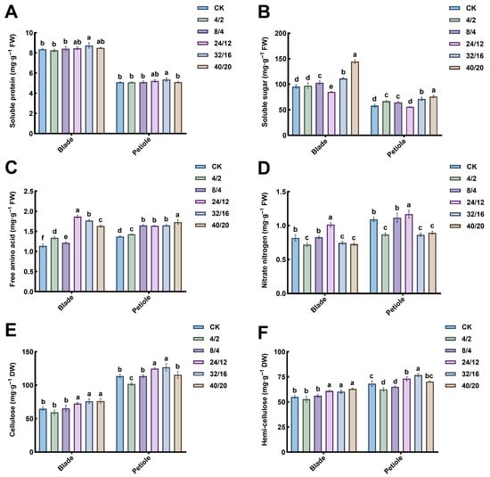 Effects of different light–dark cycles on nutrients in celery. (A) Soluble protein, (B) Soluble sugar, (C) Free amino acid, (D) Nitrate nitrogen, (E) Cellulose, (F) Hemi–cellulose. Distinct letters placed above the bars denote statistically significant differences (p < 0.05) as assessed by one-way ANOVA followed by Duncan’s multiple range test.