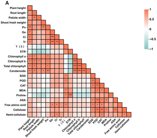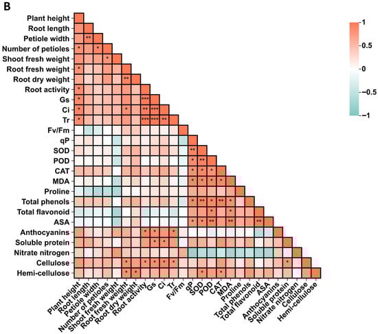 Correlation analysis of celery growth and physiology under light–dark cycles. (A) Blade, (B) petiole. Statistical significance is denoted by asterisks (* p < 0.05, ** p < 0.01, *** p < 0.001). Note: Indicators without significant correlation were excluded from the correlation analysis chart.