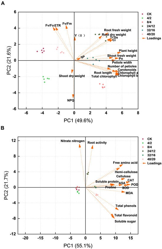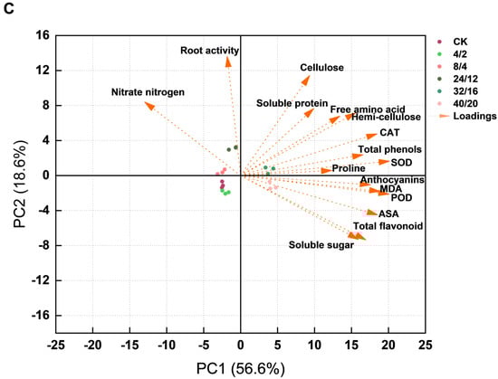 Principal component analysis of growth and photosynthetic traits (Figure 12A). The findings showed that 71.2% of the variance was explained by PC1 and PC2 (PC1: 49.6%; PC2: 21.6%). PC1 correlated positively with Gs, plant height, petiole width, and carotenoids and negatively with shoot dry weight and relative ETR. For leaf physiology (Figure 12B), PC1 (55.1%) and PC2 (21.7%) collectively explained 76.8% of the variance. PC1 showed positive loadings for cellulose, soluble protein, proline, and AsA, and a negative loading for nitrate-nitrogen. In petiole physiology (Figure 12C), 75.2% of the total variance was explained by PC1 (56.6%) and PC2 (18.6%). PC1 positively associated with POD, CAT, SOD, total phenols, proline, and anthocyanin but negatively with nitrate-nitrogen.