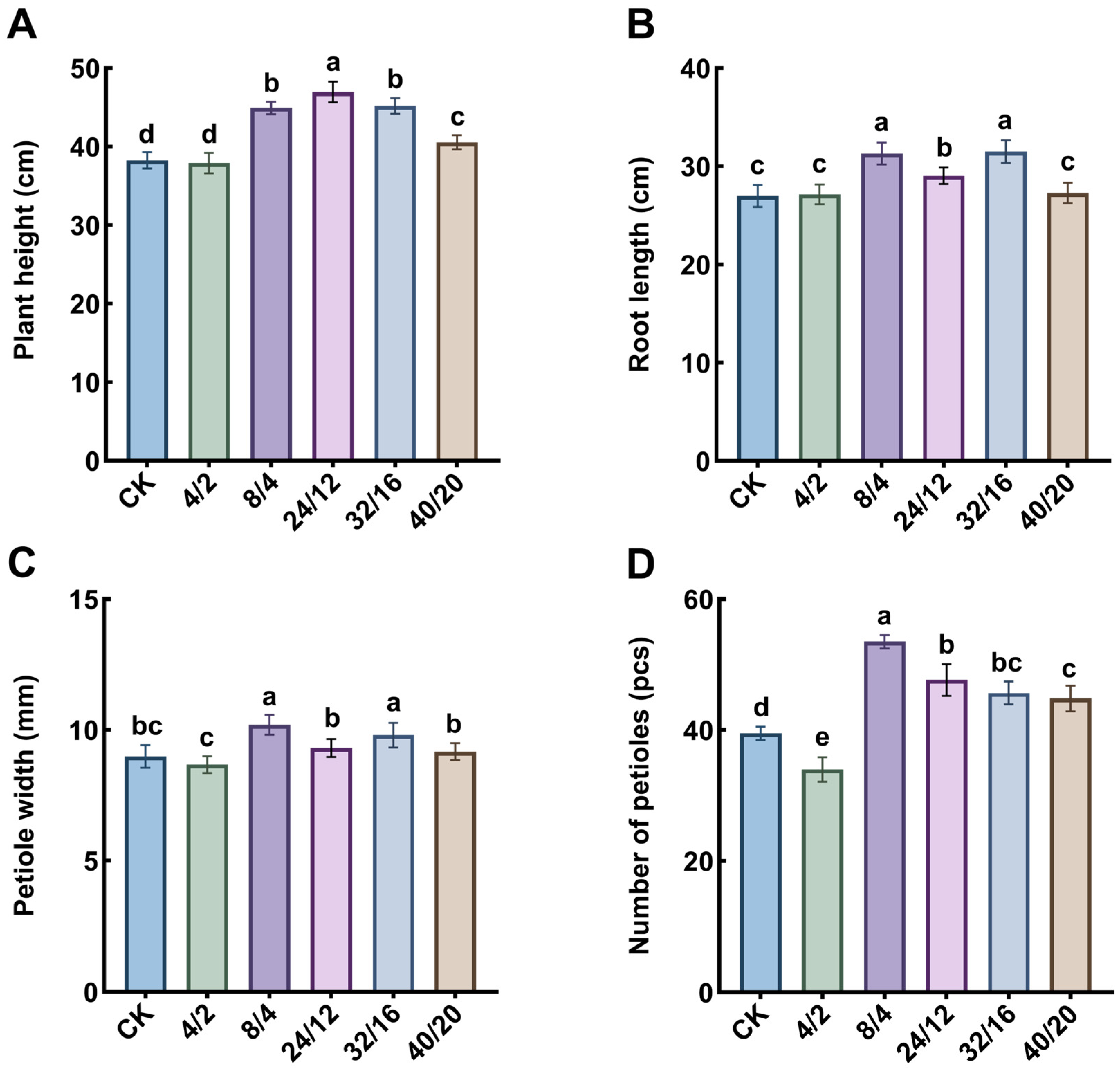 4.1. Effect of Different Light–Dark Cycles on Celery Growth and Photosynthetic Characteristics