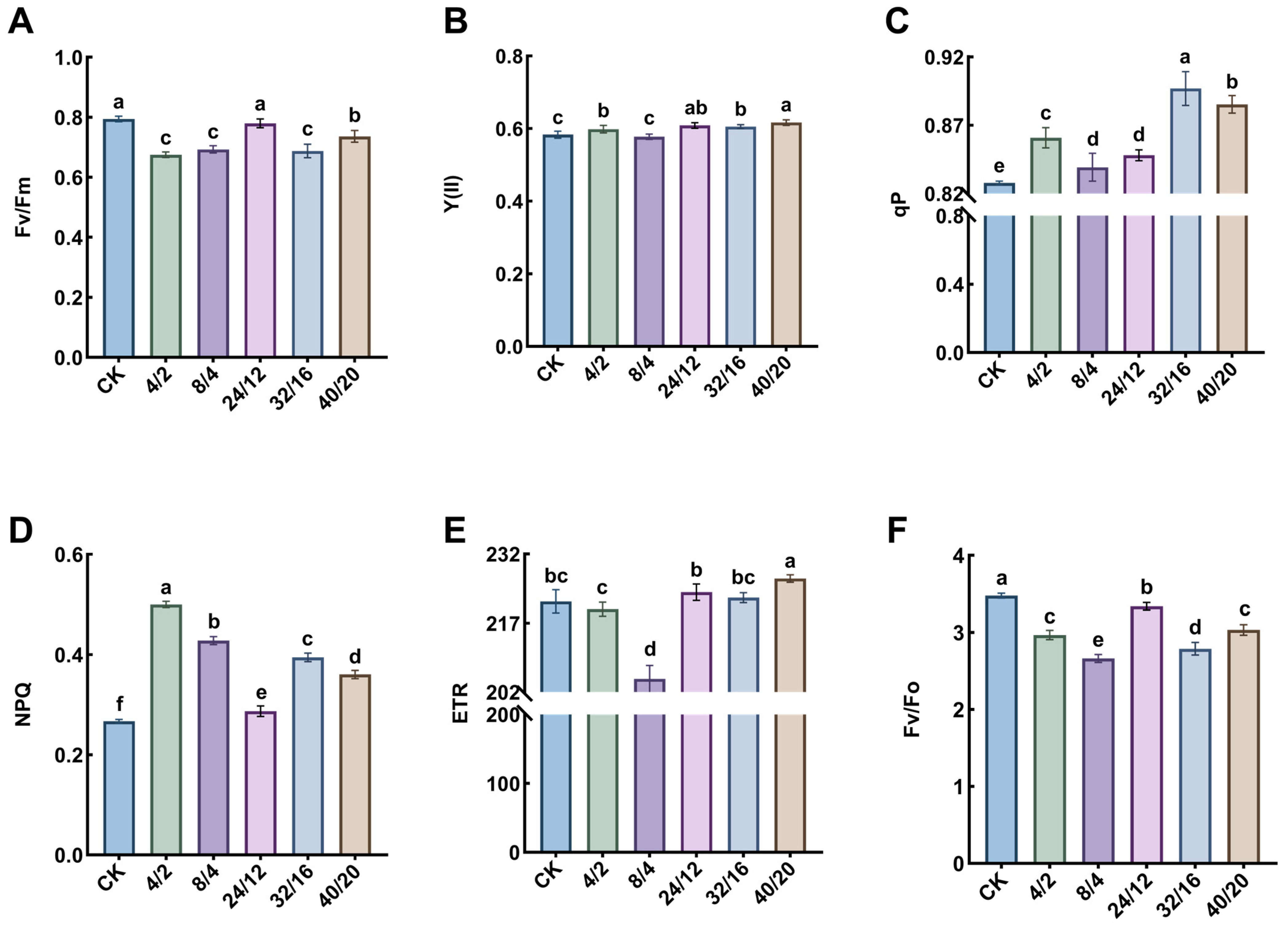 2.5. Determination of Chlorophyll Fluorescence and Photosynthetic Parameters