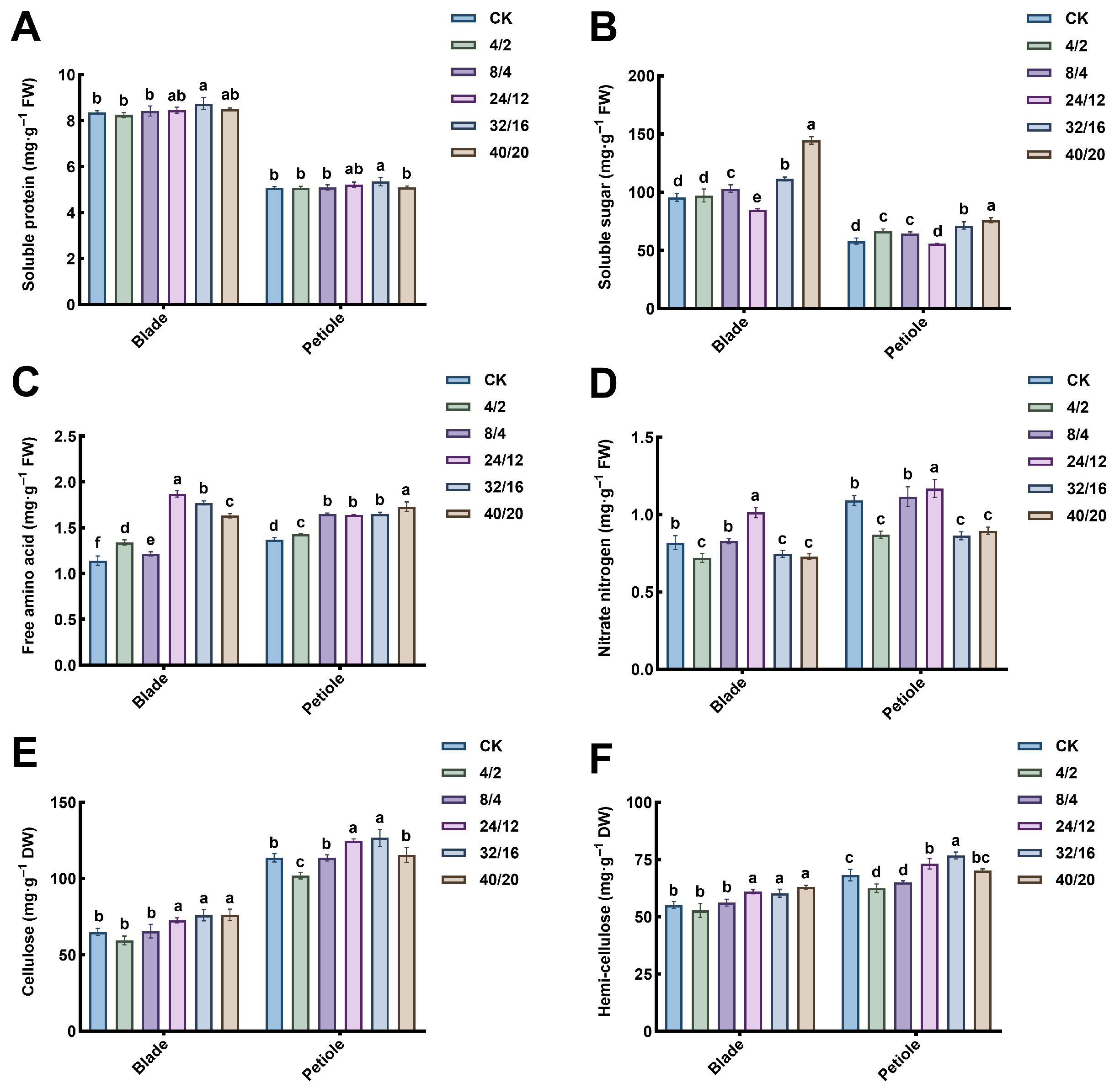 | CK | 27.0 ± 0.2 f | 12.8 ± 0.4 e | 39.7 ± 0.2 e | 9.4 ± 0.3 f |