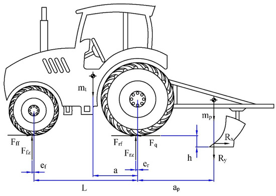 Based on the above analysis and the existing tractor platform of the research group, the centroid of the tractor is taken as the origin of the coordinate system. The force analysis of the tractor–plow system in the longitudinal plane during plowing operations is shown in Figure 1.