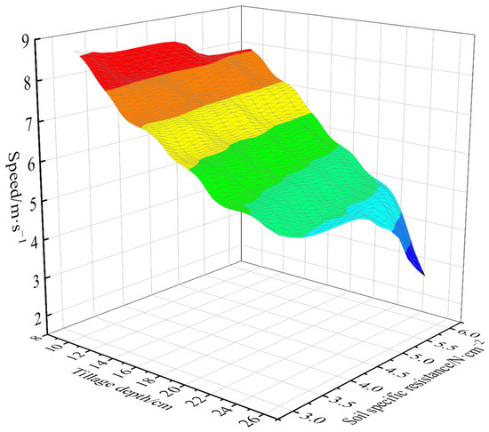 Taking tillage depth and soil specific resistance as input variables and tractor forward speed as the control parameter, a cyclic optimization algorithm was designed to perform exhaustive optimization calculations under varying tillage depths and soil resistances. The optimal target speed curves for the tractor under different operating conditions, representing the best comprehensive performance, are shown in Figure 2.