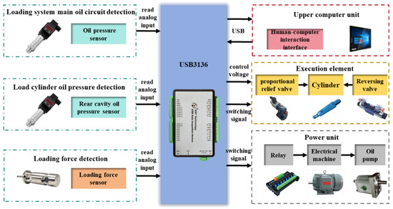 The simulated loading system mainly consists of a motor (Anhui WanNan Electric Machine Co., Ltd., Xuancheng, Anhui, China), a hydraulic pump (YOUYAN Electric Co., Ltd., Hangzhou, China), a controller (Beijing Art Technology Co., Ltd., Beijing, China), an electro-hydraulic proportional relief valve (Beijing Huade Hydraulic Industrial Group Co., Ltd., Beijing, China), a loading cylinder (Shanghai Lixin Hydraulic Co., Ltd., Shanghai, China), a damping cylinder (Shanghai Lixin Hydraulic Co., Ltd., Shanghai, China), and a load sensor (Bengbu Dayang Sensing Technology Engineering Co., Ltd., Bengbu, Anhui, China), with the system hardware configuration shown in Figure 6. Similarly, a motor-driven oil pump is used as the power source. A dual-cylinder loading scheme based on the loading cylinder and damping cylinder is designed to simulate both steady-state and dynamic resistance encountered in field conditions.