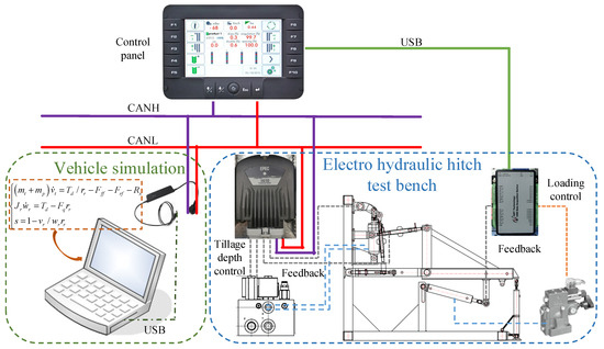 The tractor electro-hydraulic suspension test rig consists of a host computer, a tillage depth control system, and a simulated loading system [29]. The overall physical layout is shown in Figure 4.
