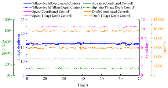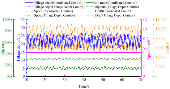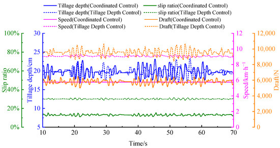 In terms of tillage quality, the standard deviations of tillage depth under depth-only control and coordinated control are 3.1 cm and 2.6 cm, respectively. This indicates that under high load fluctuations, coordinated control provides better depth stability and achieves higher tillage quality compared with depth-only control. Furthermore, as presented in Table 3, under heavy-load conditions, the proposed coordinated control method improves traction efficiency and overall efficiency–economic performance by 22.1% and 26.6%, respectively, while reducing the fuel consumption rate by 7.1% compared with the conventional depth control method at full throttle.