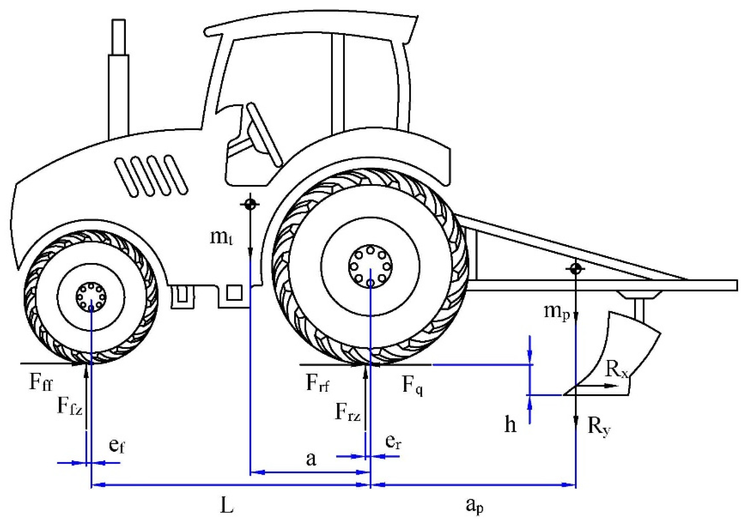 - The ground conditions under the left and right wheels of the tractor are assumed to be identical, and lateral tilting during forward motion is neglected;
