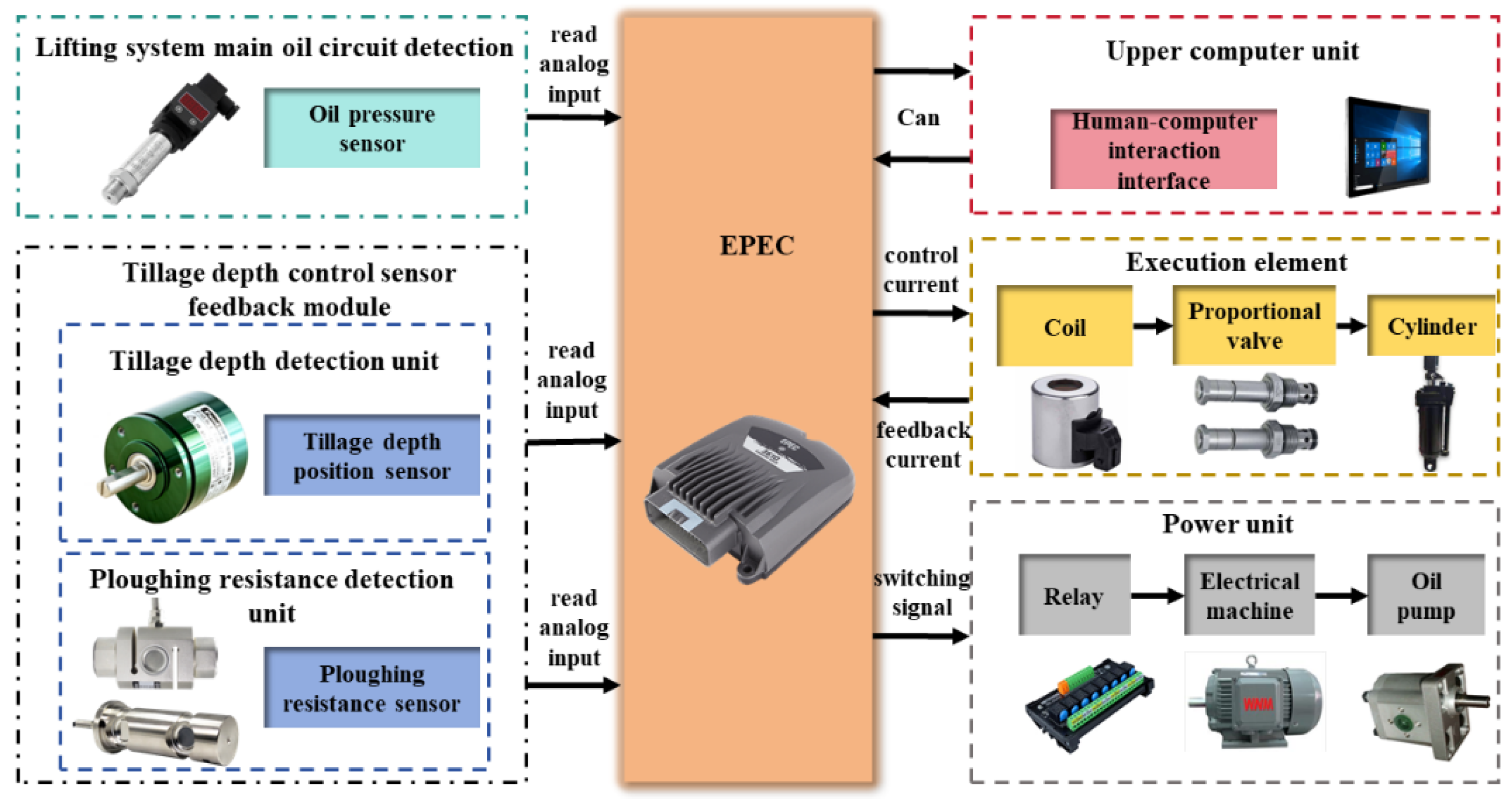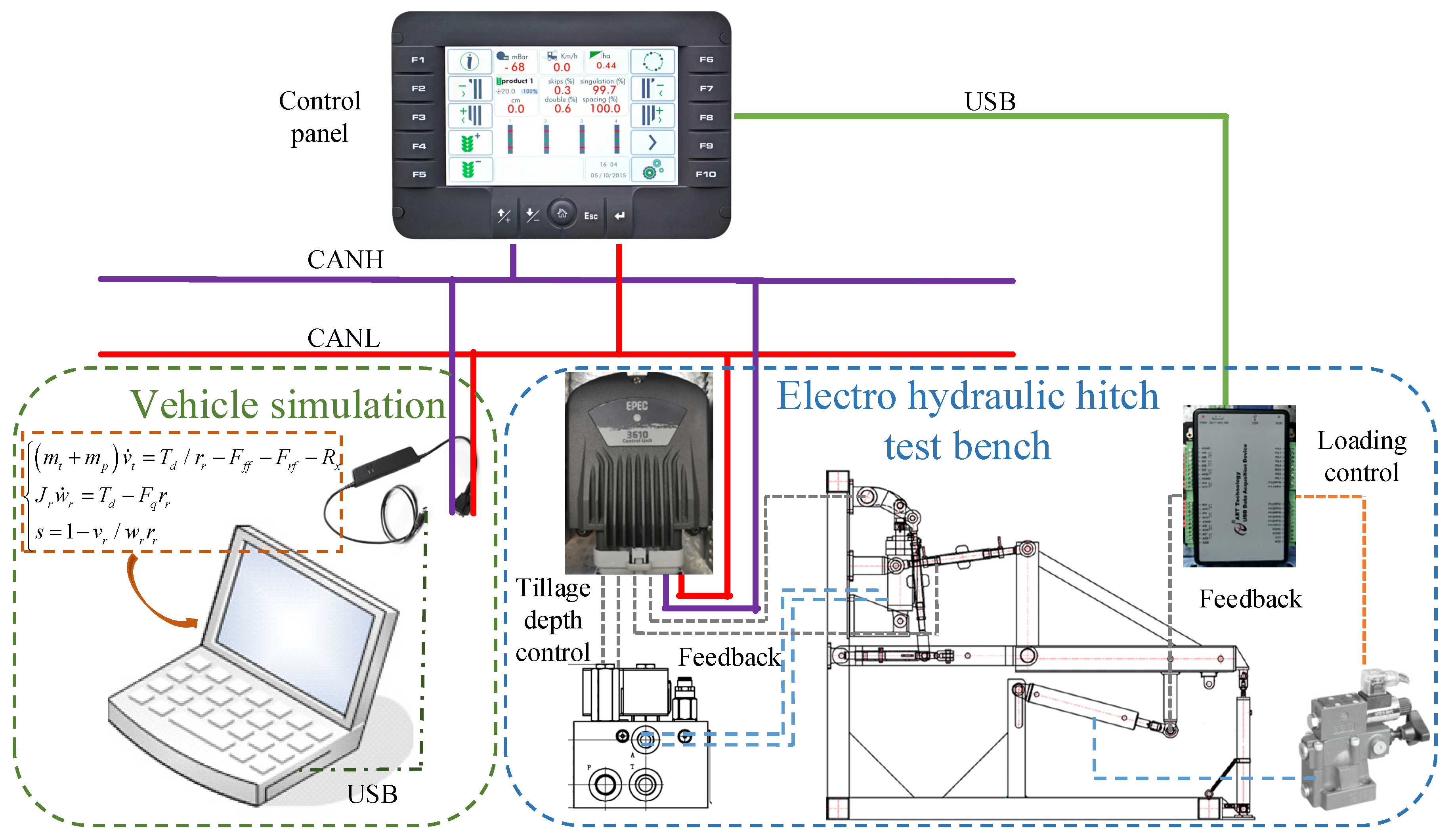 - Sun, X.; Song, Y.; Wang, Y.; Qian, J.; Lu, Z.; Wang, T. Design and test of a tractor electro-hydraulic-suspension tillage-depth and loading-control system test bench. Agriculture 2023, 13, 1884. [Google Scholar] [CrossRef]
