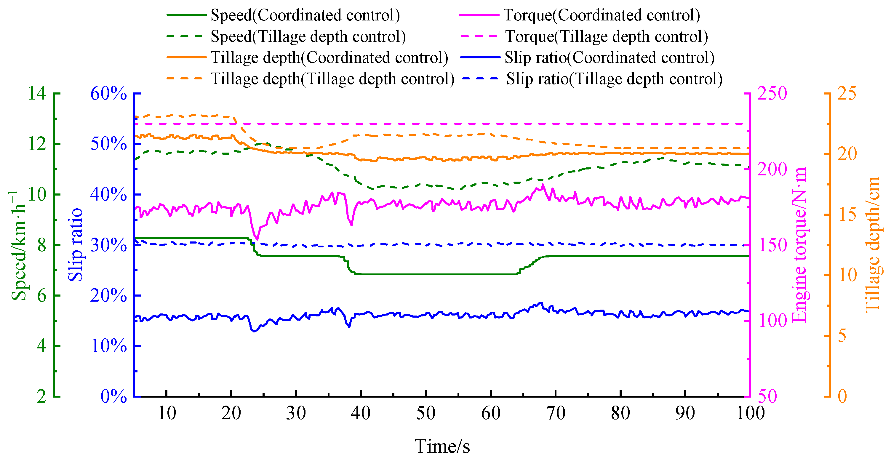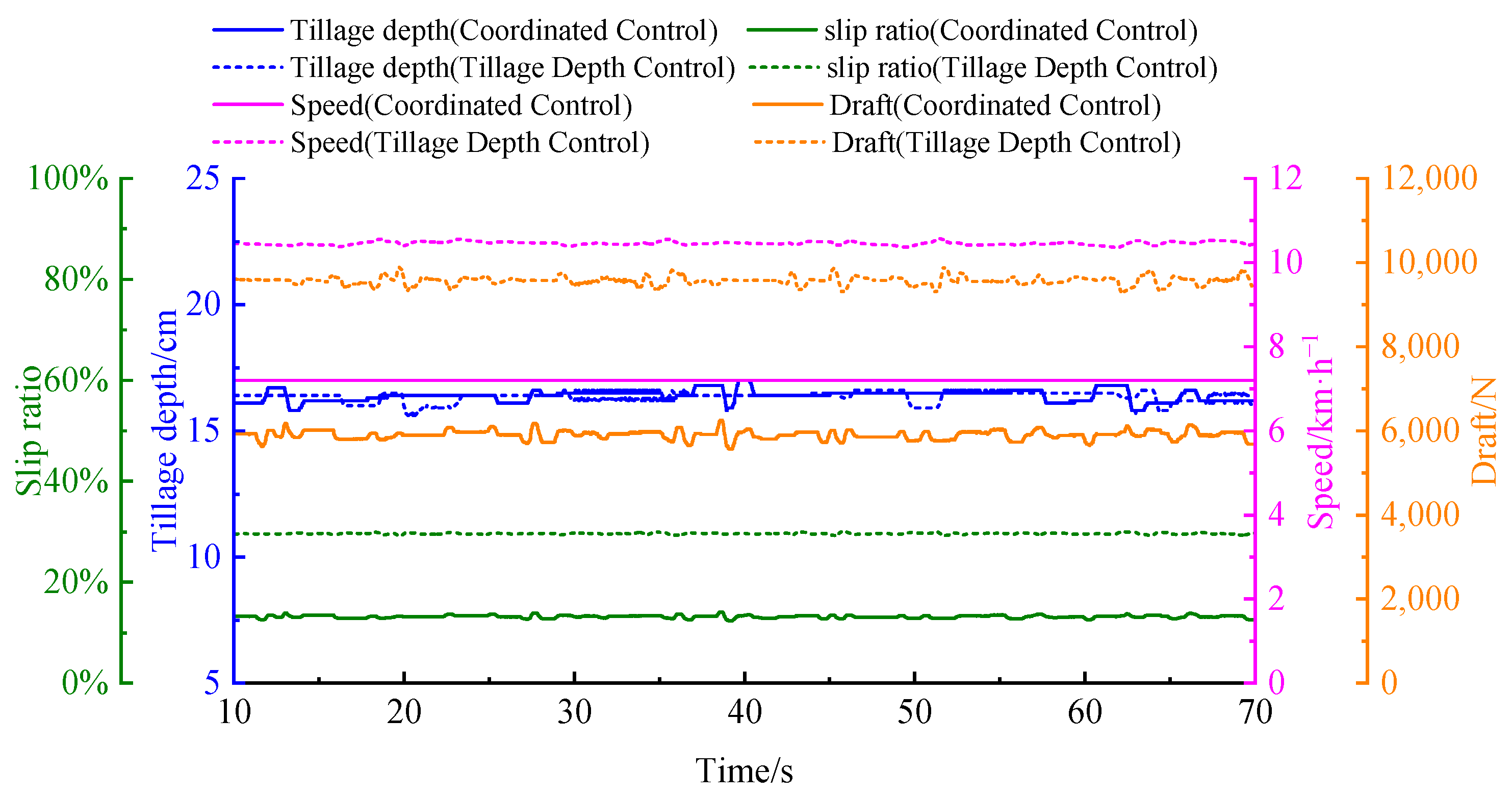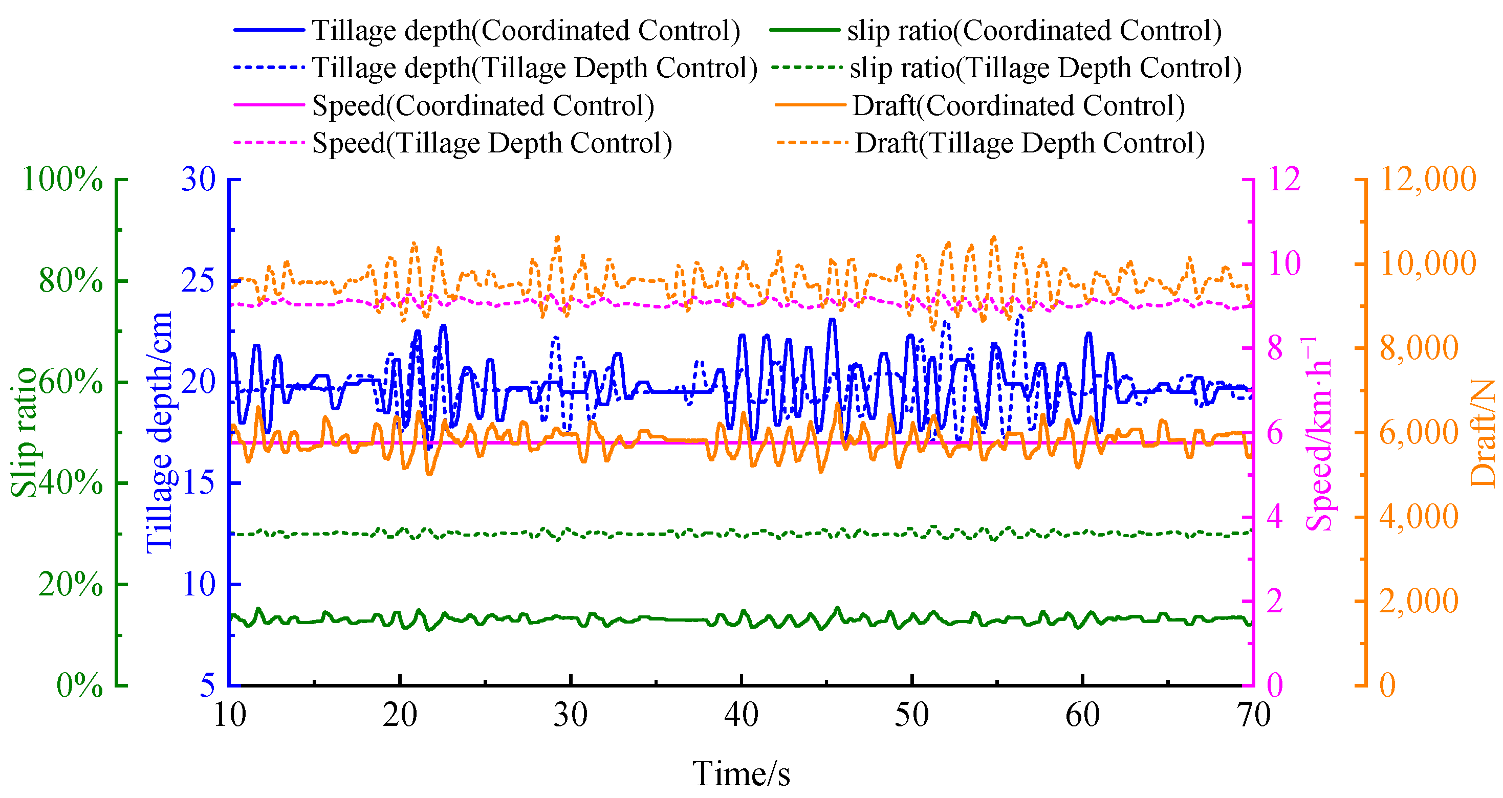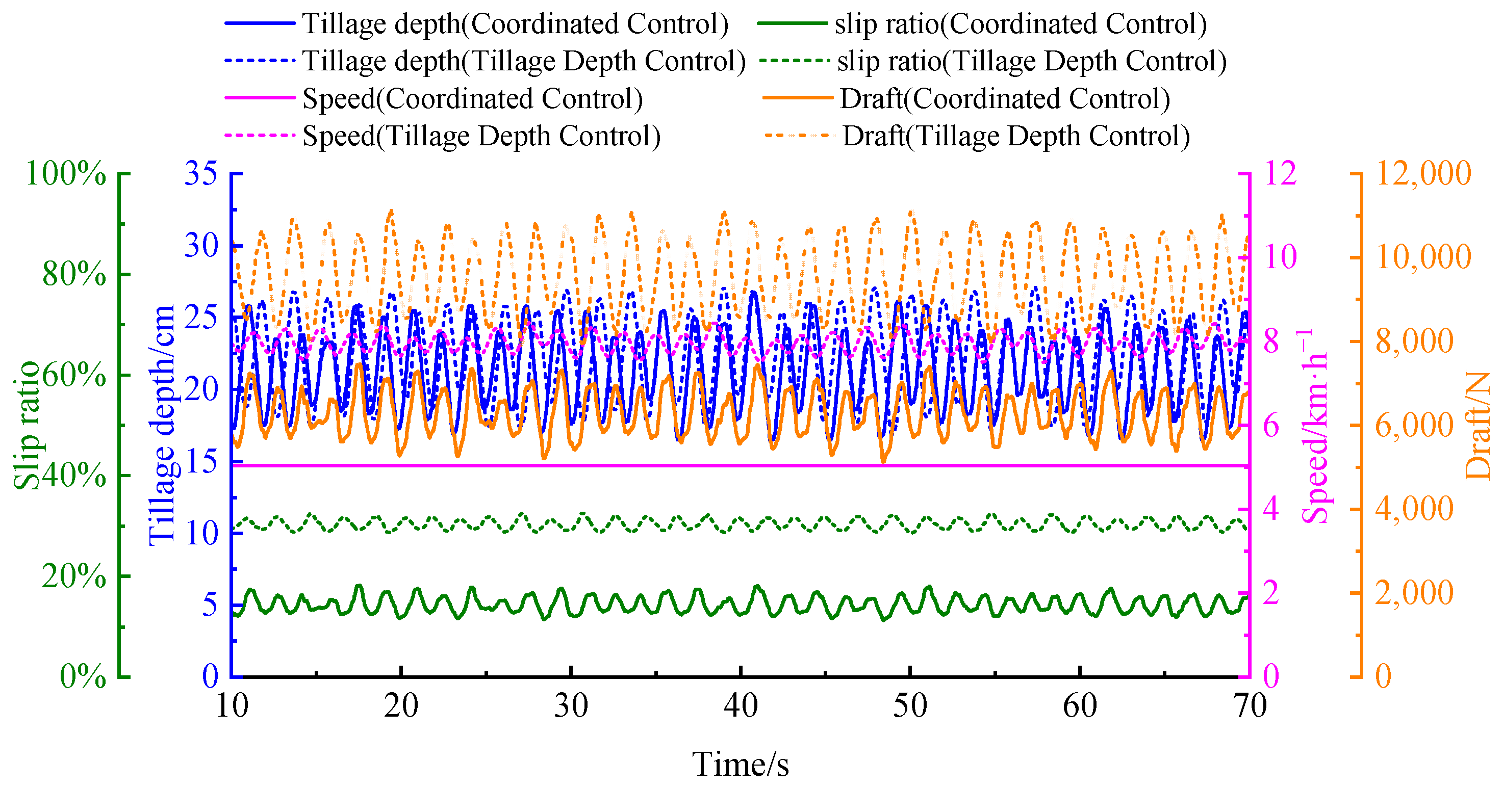 2.4.4. Comparison Between Tillage Depth–Vehicle Speed Coordinated Control and Tillage Depth Control Methods Under Different Operating Conditions