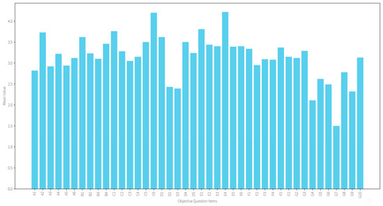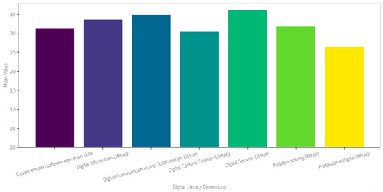 The survey questionnaire on the current status of digital literacy among tea farmers in this study has 7 primary dimensions and a total of 42 objective items. The questionnaire uses the Likert 5-point scale to score the items, with 1 point for strongly disagree, 2 points for strongly disagree, 3 points for generally agree, 4 points for strongly agree, and 5 points for strongly agree. According to the scoring of the Likert 5-point scale, the current level of digital literacy among tea farmers is classified into levels. A score below 3 indicates a relatively low level of digital literacy among tea farmers, a score in the 3–4-point range indicates a moderate level of digital literacy among tea farmers, and a score in the 4–5-point range indicates a high level of digital literacy among tea farmers. Through statistical analysis of the data collected from the survey questionnaire on the current status of digital literacy among tea farmers, the following results were obtained. The situation of the seven major digital literacy of tea farmers is shown in Table 6 and Figure 1.