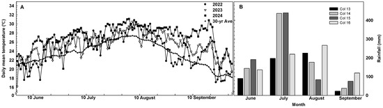 Daily Mean Air Temperature (A) and Monthly Total Rainfall (B) in Rice Cultivation Fields (2022–2024). 30-yr Ave.: Normal Temperature and Rainfall (1991–2020).