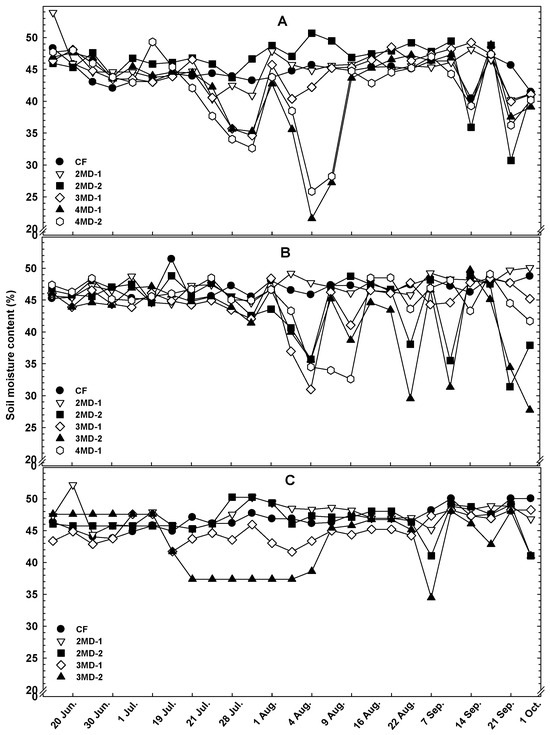 Change in soil moisture contents by water management treatments (2022, (A); 2023, (B); 2024, (C)). CF, continuously flooded; MD, mid-season drainage (2, 3, 4 weeks); MD-1, low-level water management; MD-2, alternate water irrigation.