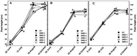 Plant height of rice (measured from June to August as plant length and the sum of culm and panicle length in October) was influenced by various water management treatments between 2022 and 2024. (A): 2022; (B): 2023; (C): 2024. CF denotes continuously flooded conditions, whereas MD represents mid-season drainage (2, 3, 4 weeks), with MD-1 indicating low-level water management, and MD-2 indicating alternate water irrigation. Different letters signify significant differences (DMRT, p < 0.05).