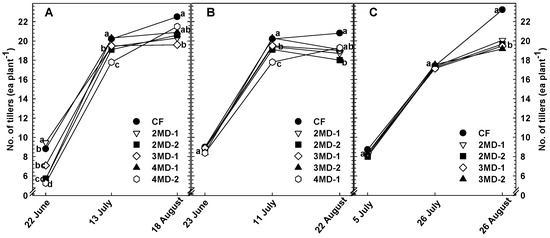 Changes in the number of tillers of rice as affected by water management treatments (2022–2024). (A): 2022; (B): 2023; (C): 2024. CF, continuously flooded; MD, mid-season drainage (2, 3, 4 weeks); MD-1, low-level water management; MD-2, alternate water irrigation. Different letters indicate significant differences (DMRT, p < 0.05).