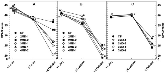 Changes in SPAD values of rice under various water management treatments (2022–2024). (A): 2022; (B): 2023; (C): 2024. CF denotes continuous flooding; MD represents mid-season drainage (2, 3, 4 weeks); MD-1 indicates low-level water management; MD-2 refers to alternate water irrigation. Distinct letters denote significant differences (DMRT, p < 0.05).