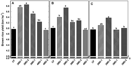 Changes in brown rice yield as affected by water management treatments (2022–2024). (A): 2022; (B): 2023; (C): 2024. CF, continuously flooded; MD, mid-season drainage (2, 3, 4 weeks); MD-1, low-level water management; MD-2, alternate water irrigation. Different letters indicate significant differences (DMRT, p < 0.05).