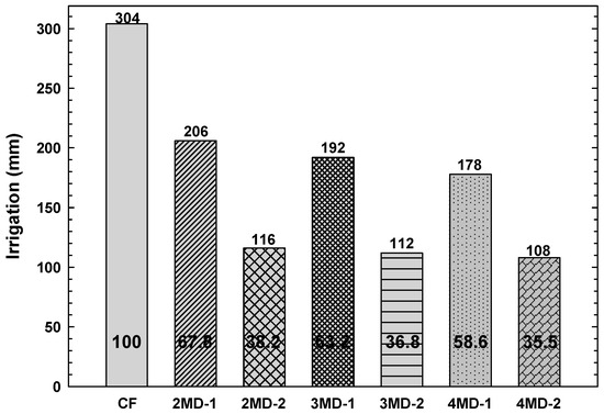 The results of irrigation water usage by water management method revealed the following hierarchy of water usage: CF > 2MD-1 > 3MD-1 > 4MD-1 > 2MD-2 > 3MD-2 > 4MD-2 (Figure 7). CF, representing continuous flooding, registered the highest water usage at 304 mm, while 4MD-2, with the lowest, marked a 64.5% reduction in water usage compared to CF. Treatment 2MD-2, which yielded the highest amount, reduced water usage by 61.8% compared to CF. As the duration of mid-season drainage increased, there was a corresponding decrease in water usage, with low-level water management consuming, on average, 26.4% less water than alternate water irrigation. The substantial water usage in continuous flooding, as noted, is not required for raising rice yield [45,46], and it has been documented that flooded conditions are essential only during the establishment and flowering stages [47]. Moreover, research has indicated that during the rice growing phase, employing simple irrigation with two periods of drainage and SRI treatments involving 1~2 cm of standing water followed by natural evaporation led to reductions in agricultural water usage by 15.2% (simple irrigation) and 47.4% (SRI) compared to continuous flooding [9]. This study confirms similar trends. Thus, the efficacy of employing low-level water management and alternate water irrigation to reduce agricultural water usage is clear, as CF consumes over twice the average amount of water. Consequently, mid-season drainage, low-level water management, and alternate water irrigation techniques in rice cultivation may serve as viable strategies to mitigate global warming and address future water scarcities.