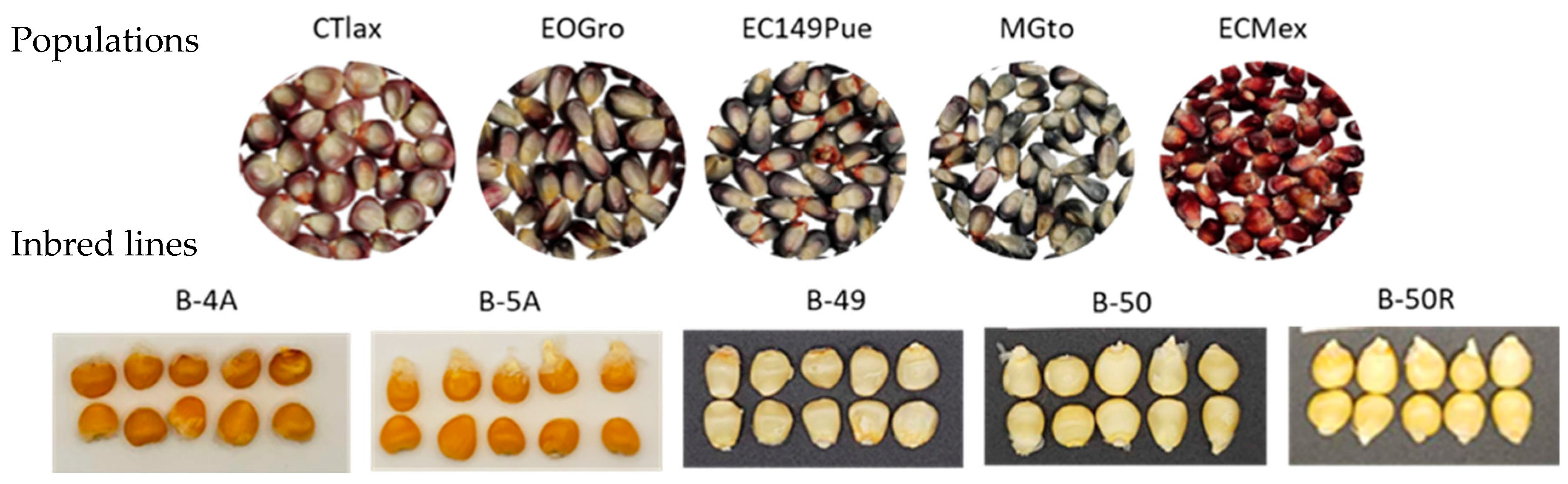 - Briones-Reyes, D.; Castillo-González, F.; Chávez-Servia, J.L.; Aguilar-Rincón, V.H.; de León García-de Alba, C.; Ramírez-Hernández, A. Response of native maize from Mexican highlands to ear rot, under natural infection. Agron. Mesoam. 2015, 26, 74–85. [Google Scholar] [CrossRef][Green Version]
