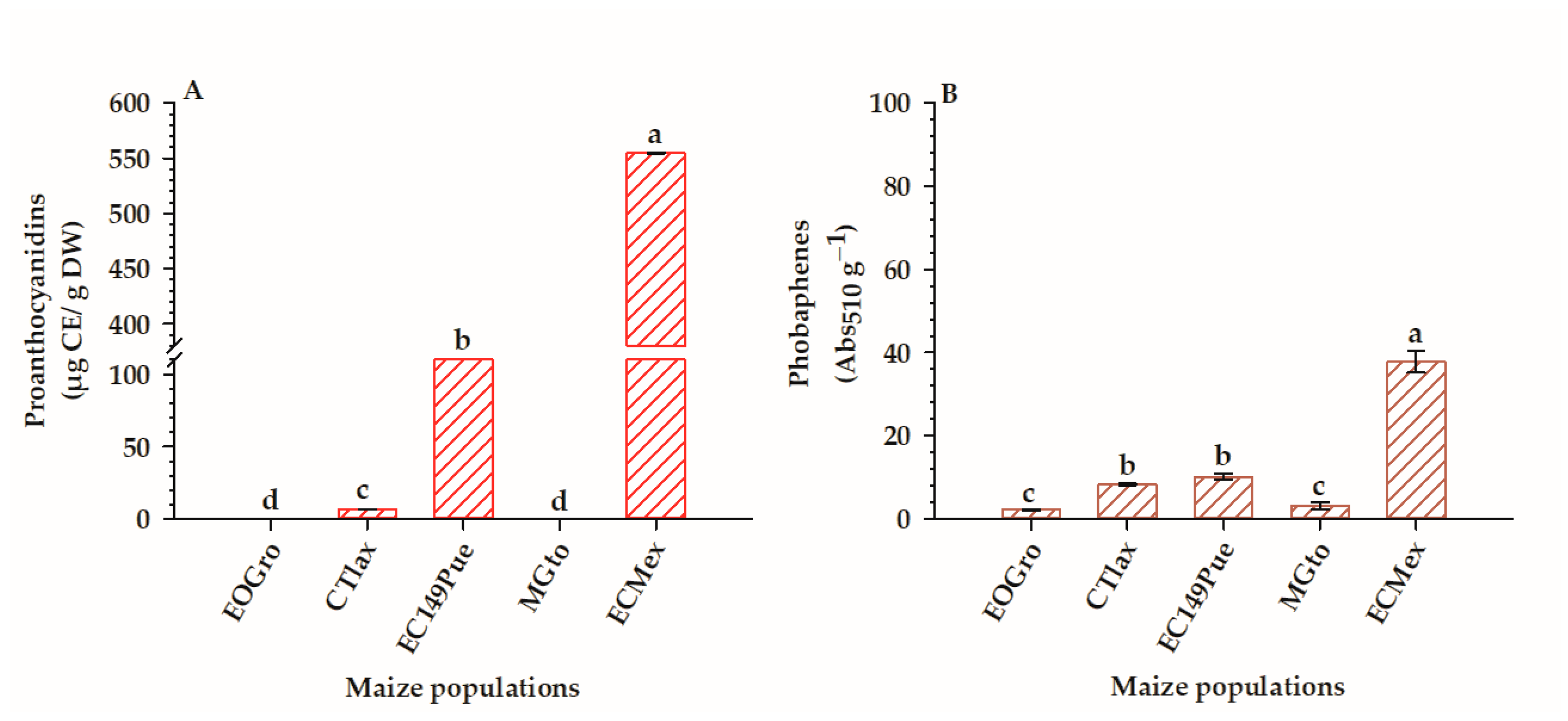 - Salinas-Moreno, Y.; Santillán-Fernández, A.; de la Torre, I.A.; Ramírez-Díaz, J.L.; Ledesma-Miramontes, A.; Martínez-Ortiz, M.Á. Physical traits and phenolic compound diversity in maize with blue purple grain (Zea mays L.) of Mexican Races. Agriculture 2024, 14, 564. [Google Scholar] [CrossRef]