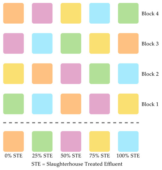 The experimental design was in randomized blocks with five treatments, namely the following: irrigation with tap water–control (0% slaughterhouse treated effluent), and the following four levels of slaughterhouse-treated effluent: 25, 50, 75, and 100%; and two vegetable crops (soybean and grain sorghum), with four replications (Figure 1). In the control treatment, sorghum received 100% of the nitrogen fertilization recommended for culture. In soybean, as it is a nitrogen-fixing crop, nitrogen fertilization was not applied. The soil of the site is classified as a Eutrophic Red Latosol, with a clayey texture, according to [18].
