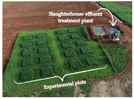 Aerial image of the experimental area, highlighting the location of the slaughterhouse effluent treatment plant in relation to the adjacent experimental plots.