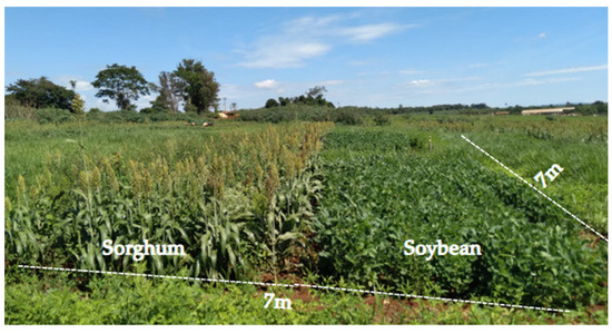 The experiment was conducted using the following two grain crops: soybean (Glycine max (L.) Merr.) and sorghum (Sorghum bicolor (L.) Moench), grown simultaneously in 49 m2 experimental plots (7 m × 7 m) (Figure 3). Each plot was divided into two subplots, with 7 planting rows allocated to each species. Sowing was performed manually at a depth of 3 cm, with 0.5 m row spacing. Sorghum was sown on 1 November 2022, and soybean on 2 November 2022. Harvesting followed the following crop-specific maturity criteria: sorghum was harvested when plants reached approximately 35% dry matter, and soybean was harvested at the R6 stage, when grain moisture content ranged from 13% to 15%.