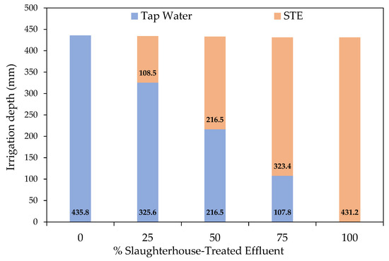 Irrigation depth applied, using tap water and slaughterhouse-treated effluent as source, with values presented separately per treatment for comparison of effects on crops.