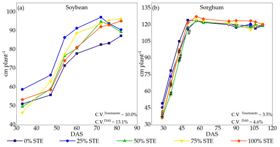 The analysis of sorghum canopy height (Figure 5b) did not show the same behavior observed for soybean crops when comparing the different concentrations of slaughterhouse-treated effluent with the control treatment (0% STE). In the first four evaluations in time (DAS), significant statistical differences were observed, indicating that the plants in the control treatment had higher canopy height compared to the plants that received the effluent.
