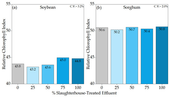 Relative Chlorophyll Index (RCI) of soybean (a) and sorghum (b) plants, irrigated with slaughterhouse-treated effluent in concentrations (25%, 50%, 75%, and 100% STE) and the control (0% STE), by the Tukey test at the level of 5% probability.