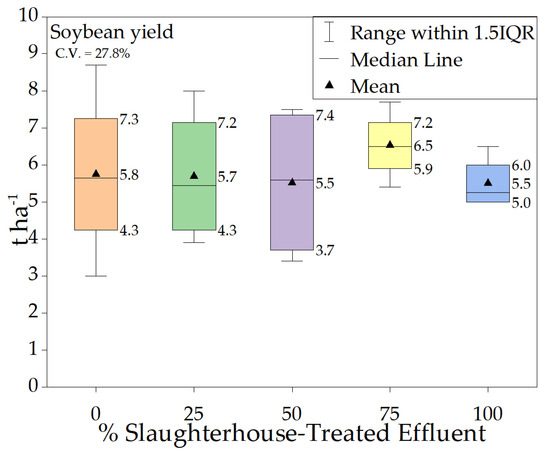 Soybean yield (t ha−1) under irrigation with slaughterhouse-treated effluent (STE) at different concentrations (25%, 50%, 75%, and 100%), compared to the control treatment (0% STE). Boxes represent the interquartile range (IQR), with the median (line) and mean (▲) indicated.