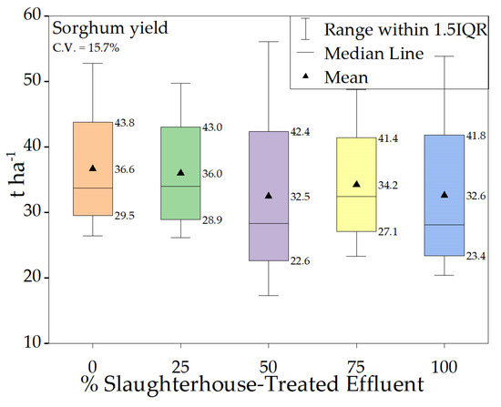 Sorghum green mass yield varied among treatments, with the control (0% STE, irrigated with tap water) presenting the highest productivity, reaching 36.6 t ha−1. This value was 4 t ha−1 greater than that obtained under 100% treated slaughterhouse effluent (STE) irrigation (32.6 t ha−1). The widest range in yield was observed in the 50% STE treatment, from 22.6 to 42.5 t ha−1. It is noteworthy that expected sorghum green mass production ranges between 35 and 50 t ha−1, according to Sawazaki et al. [26].