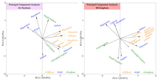 Principal Component Analysis (PCA) illustrates the relationships among the chemical characteristics of slaughterhouse-treated effluent (STE), the chemical properties of the experimental soil, and the agronomic performance of soybean (A) and sorghum (B) crops.