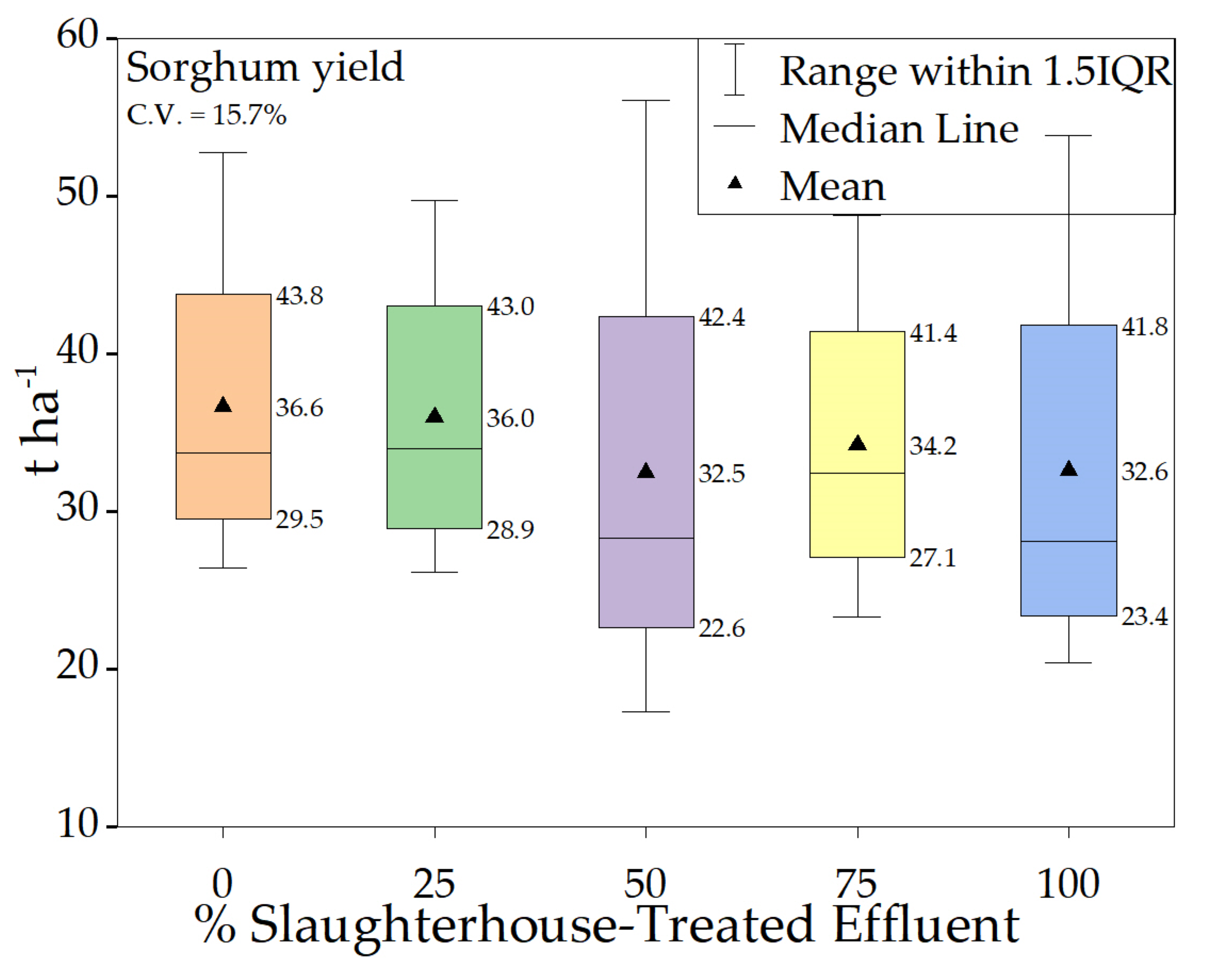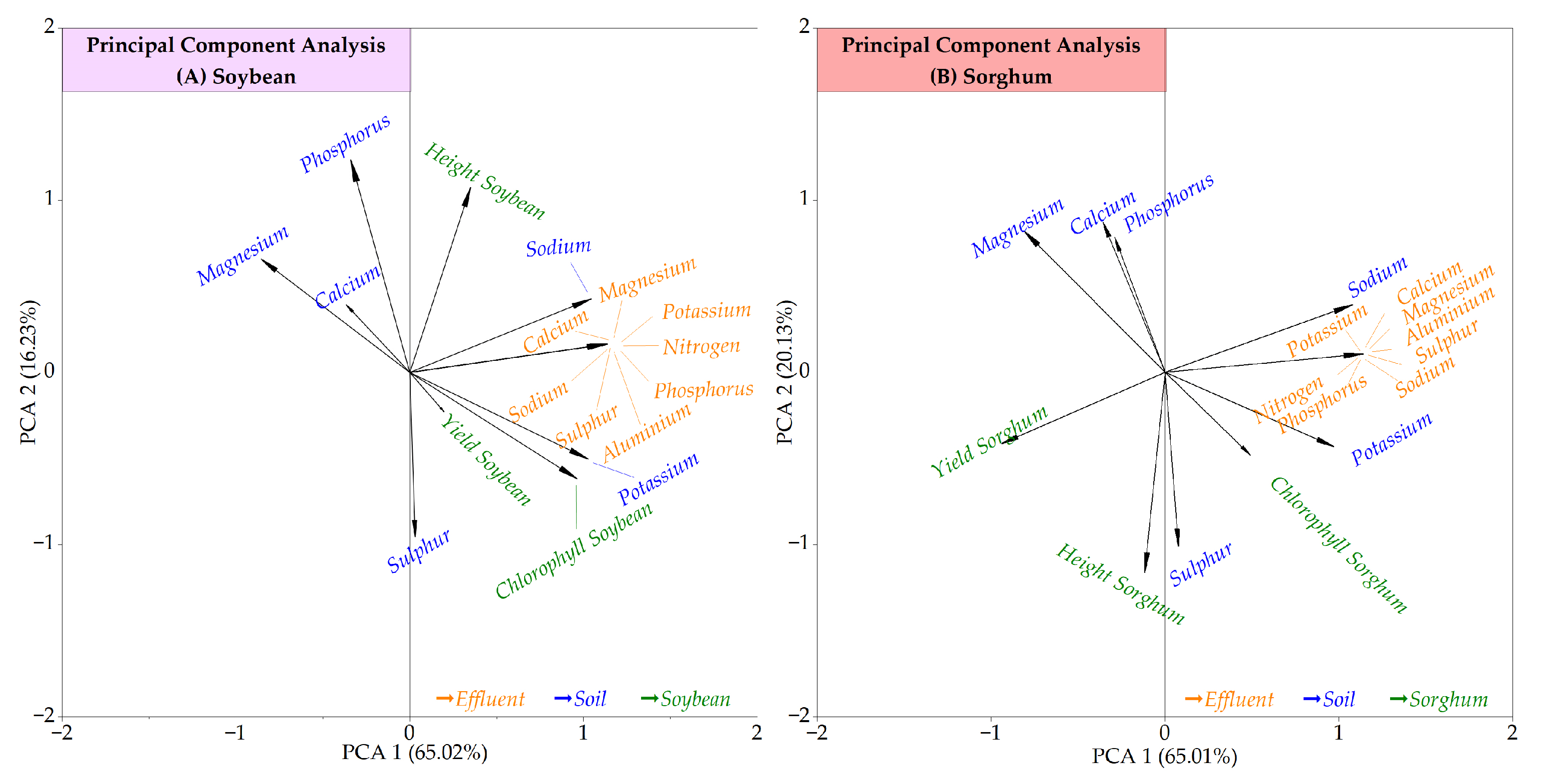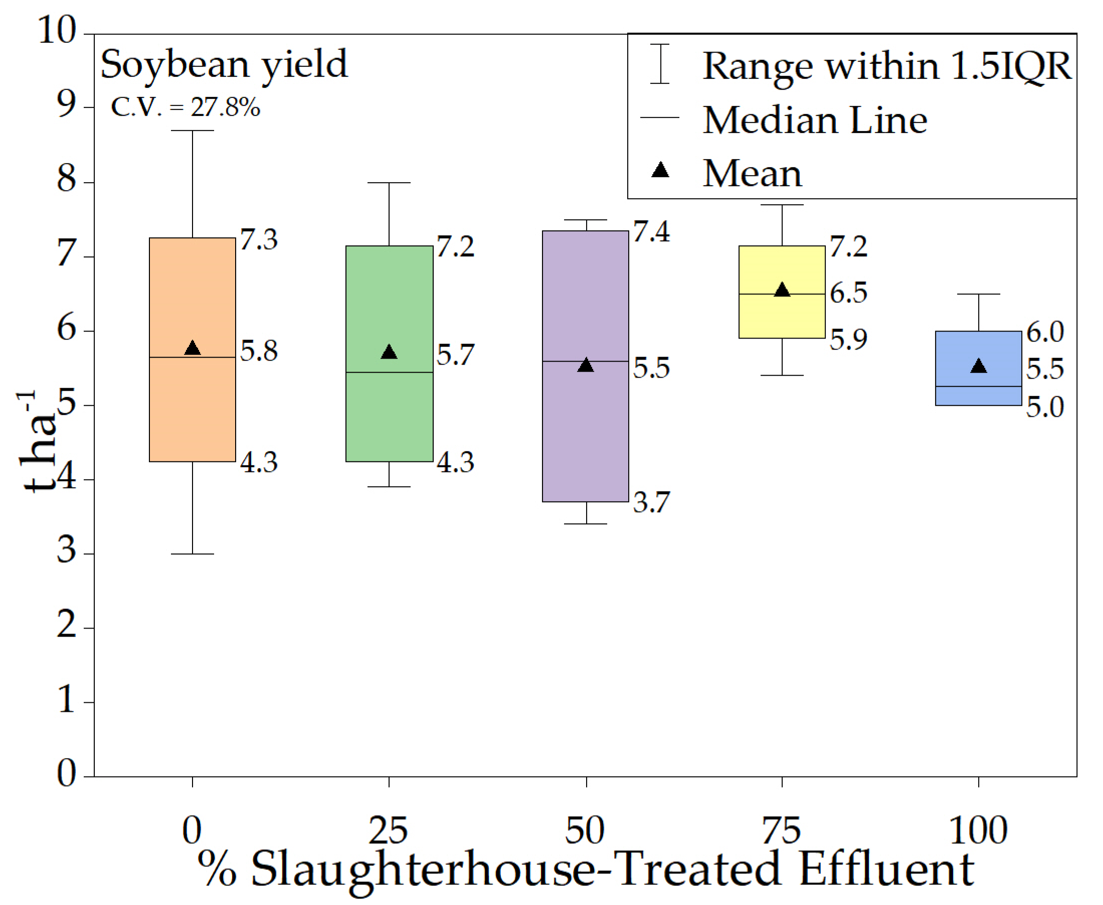 3.3.3. Yield of Soybean and Sorghum Irrigated with Slaughterhouse-Treated Effluent