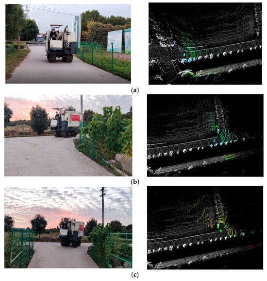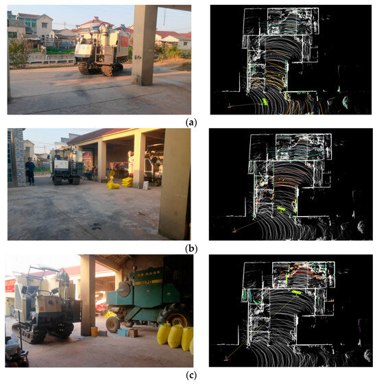 Unmanned agricultural machinery driving constitutes the core of intelligent agricultural development, effectively reducing labor requirements and enhancing agricultural productivity [1,2,3]. Currently, unmanned autonomous navigation primarily involves constructing a scene map, acquiring the vehicle’s pose via GNSS positioning technology, planning operational paths, and enabling the machinery to follow these paths through path-tracking algorithms to accomplish unmanned field operations [4,5]. Autonomous operations in exiting/entering machinery sheds and traveling on farm access roads are essential components of fully unmanned agricultural production. However, agricultural machinery sheds are often enclosed or semi-enclosed environments where GNSS signals are obstructed, while on farm access roads, trees on both sides can cause GNSS signal drift. As a result, existing GNSS-based automatic navigation systems cannot operate in these environments, leaving no alternative to manual driving. Therefore, it is particularly imperative to develop an autonomous navigation system suitable for machinery sheds and farm access road environments.