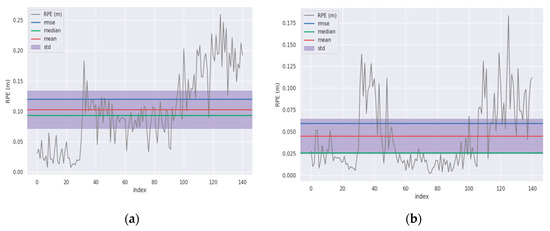 As presented in Table 2, the improved algorithm also achieves substantial reduction in RPE: the maximum error decreased by 29.35%, the mean error by 56.29%, the median error by 72.51%, the minimum error by 75%, the RMSE by 50.13%, and the standard error by 36.25%. In the shed environment, the RPE of the improved algorithm is significantly lower.