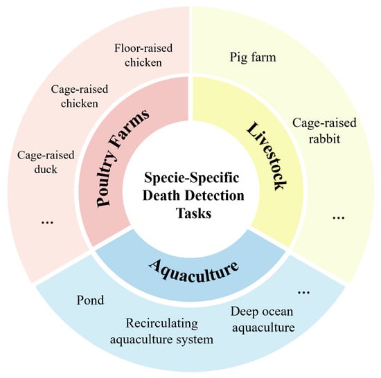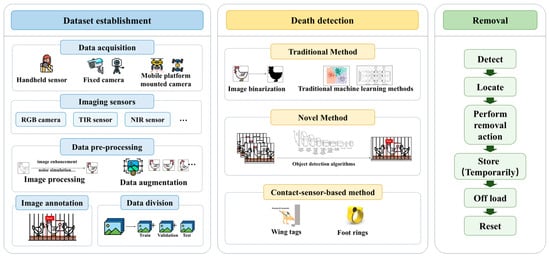 As shown in Figure 1, death detection and removal are two sequential tasks, since the removal action depends on detection models for locating the deceased. In this article, we divide the detection process into three stages: data acquisition, dataset establishment, and data processing. Each section is separately discussed, focusing on the specific devices used and typical working scenarios. Existing removal devices are also reviewed and organized, presenting available designs to innovate future research. The overall structure of the article is organized as follows. Section 2 discusses specific death detection methods, providing details on how original datasets are established and how detection models are designed and tested. Section 3 presents multiple existing designs on inspection devices, while Section 4 presents removal devices and their integration with detection models. Section 5 contains a discussion based on our findings from reviewing the previous related works. Finally, Section 6 provides our thoughts on current challenges and recommendations for future research. The specie-specific detection tasks discussed in the review are presented in Figure 2.