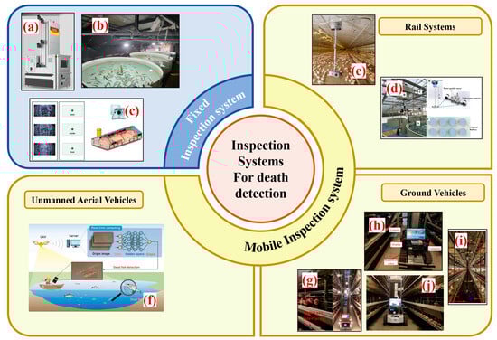 In recent years, vision-based systems in agriculture have experienced rapid growth, significantly improving the efficiency and accuracy of various tasks across all sectors of precision agriculture. Among these advancements, agricultural inspection systems have shown great potential in ensuring the operational integrity of farming environments and monitoring animal health and welfare. These systems offer a more efficient, reliable, and autonomous alternative to traditional manual inspections. In the specific context of death detection for high-density animal farming, inspection systems play a crucial role by capturing vision-based information and enabling real-time mortality detection through advanced image processing techniques. While numerous vision-based detection models have been proposed for death detection tasks, such as YOLO and Faster R-CNN, their practical implementation in real-world scenario relies heavily on the integration with robust and adaptable hardware systems. Typically, the hardware design of agricultural inspection system mainly includes one or more imaging sensors, which may be either fixed on stationary structures or mounted on mobile platforms. In this section (Section 3), we present existing designs on inspection systems, focusing on their advantages and limitations for death detection tasks. Typical designs of the systems are presented in Figure 3.
