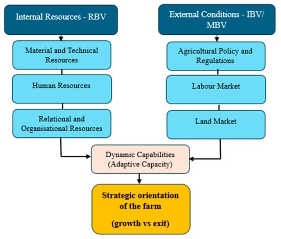 The model distinguishes two main domains influencing farmers’ strategic orientation: internal resources and external conditions. On the internal side (RBV), three key resource groups are identified, namely material and technical, human, and relational and organisational, which together determine the farm’s production and management potential. On the external side (IBV/MBV), the framework highlights institutional and market factors, including agricultural policy and regulations, as well as the functioning of land and labour markets. These two domains interact through the farm’s dynamic capabilities, understood as its adaptive capacity, that is, the ability to transform, combine, and reconfigure resources in response to changing external conditions. Ultimately, this interaction determines the farm’s strategic orientation, expressed through the choice between development and exit pathways.