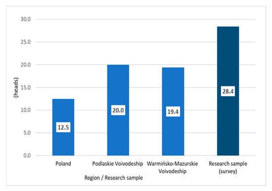 The average cow herd count was 28.4, which is over twice Poland’s average (12.5 in 2023) and above the values for voivodeships with the highest concentration of dairy cattle farming: Podlaskie (20 heads) and Warmińsko-Mazurskie (19.4 heads) (Figure 3). The sample average was affected by several large farms, as indicated by the median of 20 heads, which is closer to the values observed in dairy regions. The analysis of agricultural land suggests similar results (Figure 4). The 2023 average area for Poland was 12 hectares. In contrast, it was much higher in the sample, similar to the values for Podlaskie and Warmińsko-Mazurskie.