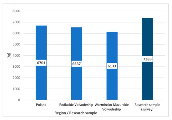 The average dairy cow milk yield in the sample was 7.4 thousand kilograms per year, while the Polish average was 6.7 thousand kilograms (Figure 5). This means that the sample had a higher yield than Poland’s and regional averages.