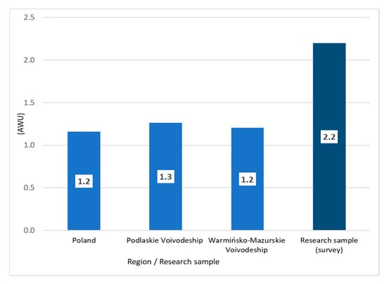The average labour input expressed as AWU indicates higher labour intensity on the surveyed farms (Figure 6). It was 2.1 AWU for the sample vs. 1.3 AWU for Poland and 1.5 AWU for the Podlaskie and Warmińsko-Mazurskie Voivodeships. According to FADN, the average for Polish dairy farms is 1.7 AWU. These results confirm that dairy farming is more labour-intensive than the average agricultural sector, and the sample exhibits particularly high labour input.