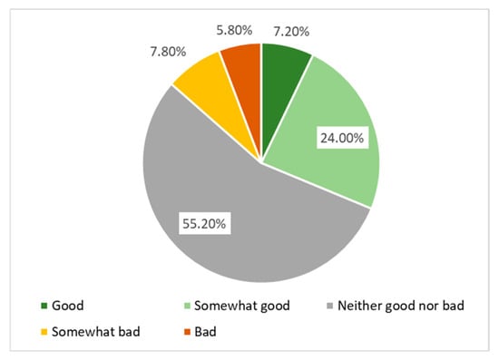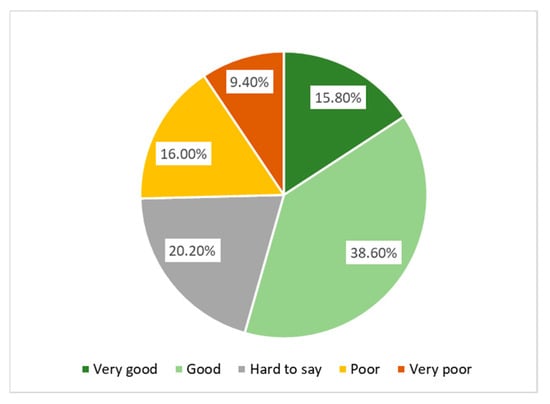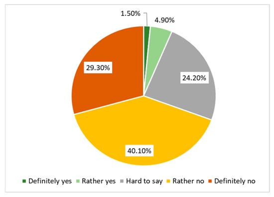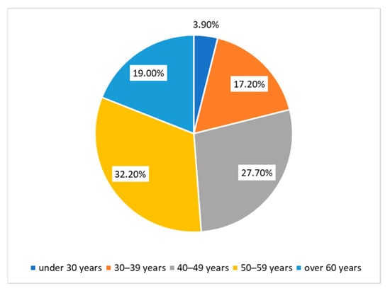 Next, demographics and subjective assessments of the respondents are presented, as they are relevant to analysing the future scale of milk production. The age structure is dominated by farmers aged 40–59 years (nearly 60% of the sample). Young farmers under 30 years accounted for less than 4%, while those over 60 years made up 19% (Figure 7). Age is directly linked to self-assessed health. Over half of the respondents (54%) believed their perceived health and work ability (5-year horizon) to be adequate for expanding or maintaining milk production, while about one-quarter were pessimistic about their health-related capabilities (Figure 8).