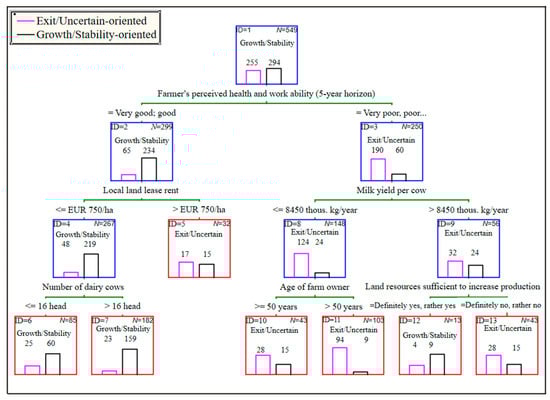The CART model is exploratory, which makes it sensitive to minor data alterations and the selection of splitting parameters. Cross-validation reduced but did not eliminate the risk of overfitting. The method of farm categorisation represents another limitation. In the main part of the analysis, respondents’ answers (dynamic growth, slow growth, stability, slow reduction, winding up, hard to say) were aggregated into two analytical categories: growth/stability-oriented and exit/uncertain-oriented.