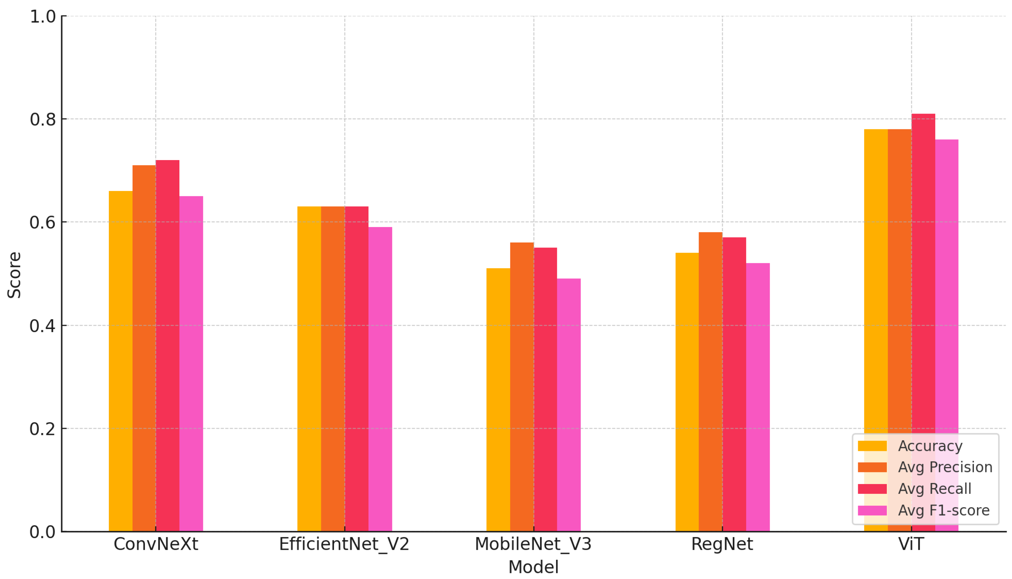 Batch 4 represented another high-performance stage, with the ViT peaking at 0.85 accuracy and a 0.85 average F1-score, demonstrating strong cross-generational generalisation (