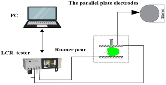As shown in Figure 1, dielectric properties of Ruaner pear were measured using a precision LCR meter [23] (HIOKI, IM3536, Shanghai, China). The instrument was connected to a custom-built parallel-plate electrode system consisting of two circular copper plates (3 mm thickness × 35 mm diameter). The electrode spacing was adjusted to fit the fruit size [10]. Prior to measurement, the LCR meter was preheated for 1 h to ensure operational stability. Calibration was conducted following the manufacturer’s protocol, including open-circuit and short-circuit compensation of the electrode plates, followed by dielectric measurements of air to verify calibration accuracy. If deviations exceeded ±0.5%, recalibration was performed. Measurements were conducted over a frequency range of 4 Hz to 1 MHz, covering 626 discrete frequency points. During testing, each pear was placed centrally between the electrodes, and readings were taken from two symmetrical positions along the equatorial plane. The upper spiral knob was adjusted to maintain consistent electrode–surface contact pressure. The LCR meter was interfaced with a laptop via USB for real-time acquisition and recording of dielectric parameters. A total of eight dielectric parameters were obtained: parallel equivalent capacitance (Cp), parallel equivalent resistance (Rp), impedance (Z), susceptance (B), conductance (G), quality factor (Q), reactance (X), and dielectric loss factor (D). For each sample, measurements were performed in duplicate. Three pears were tested per batch, resulting in six replicate measurements. Data were averaged across replicates, and variability was expressed as the mean ± standard deviation (SD). Ambient temperature (20 ± 1 °C) and relative humidity (60 ± 5%) were controlled throughout to ensure consistency.