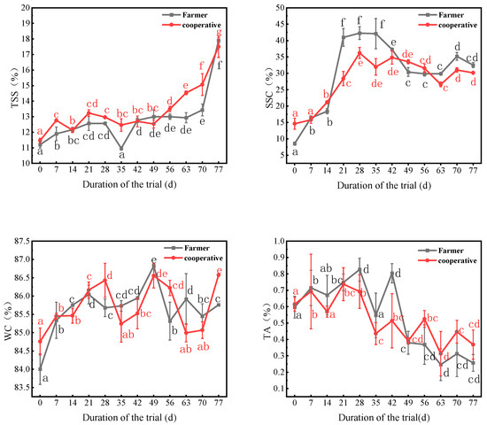 The main quality attributes and temperatures of Ruaner pear are shown in Figure 2 and Figure 3. Overall, both farmer- and cooperative-stored pears exhibited comparable quality evolution patterns, with differences primarily attributable to distinct storage temperature environments. TSS is a crucial attribute of fruit quality and storage performance [26]. The total soluble solids (TSS) of both groups increased progressively throughout the post-ripening and variable temperature stages (p < 0.05), reflecting the continuous conversion of polysaccharides into soluble sugars [27]. The sharp rise in TSS after 63 d coincided with the transition to variable temperature freezing storage, where reduced enzymatic activity and limited moisture diffusion slowed solute degradation, thereby increasing TSS accumulation. Despite this, the TSS difference between the two sources remained statistically insignificant (p > 0.05), suggesting a similar metabolic trend.