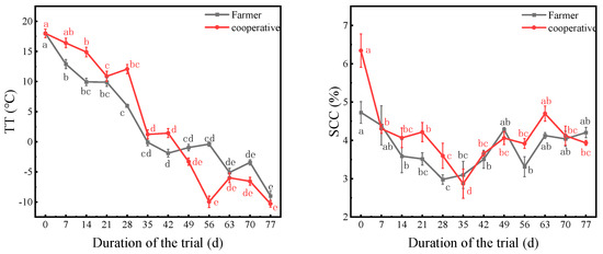 Changes in TT and SCC of the Ruaner pear. Different letters (a–e) indicate significant differences (p < 0.05); letters farther from “a” represent greater differences.